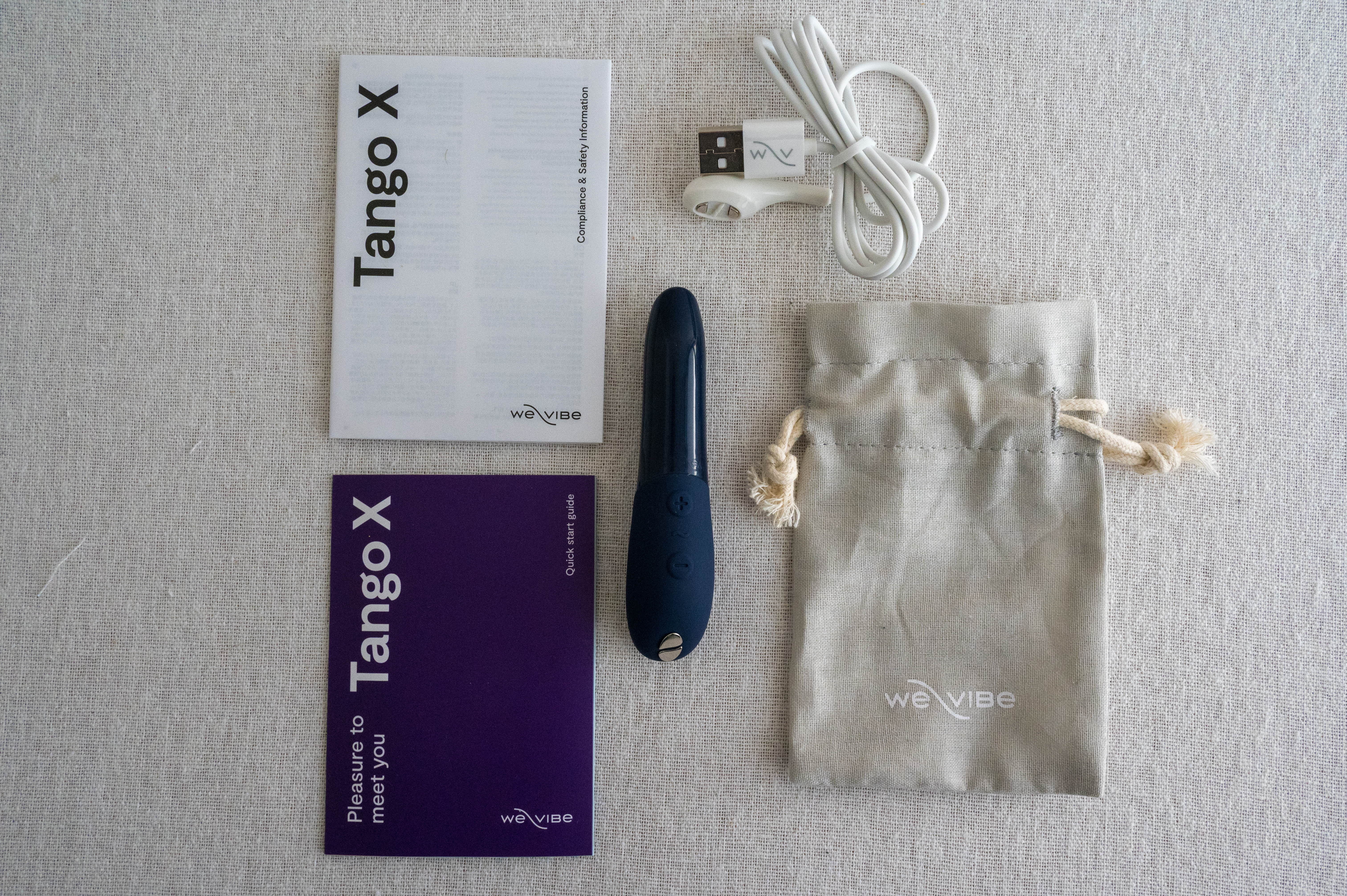 The Tango X comes in a box that just screams We-Vibe. Think deep navy tones paired with a lighter blue – sleek, bold, and totally in line with the toy’s whole "powerful but polished" vibe.