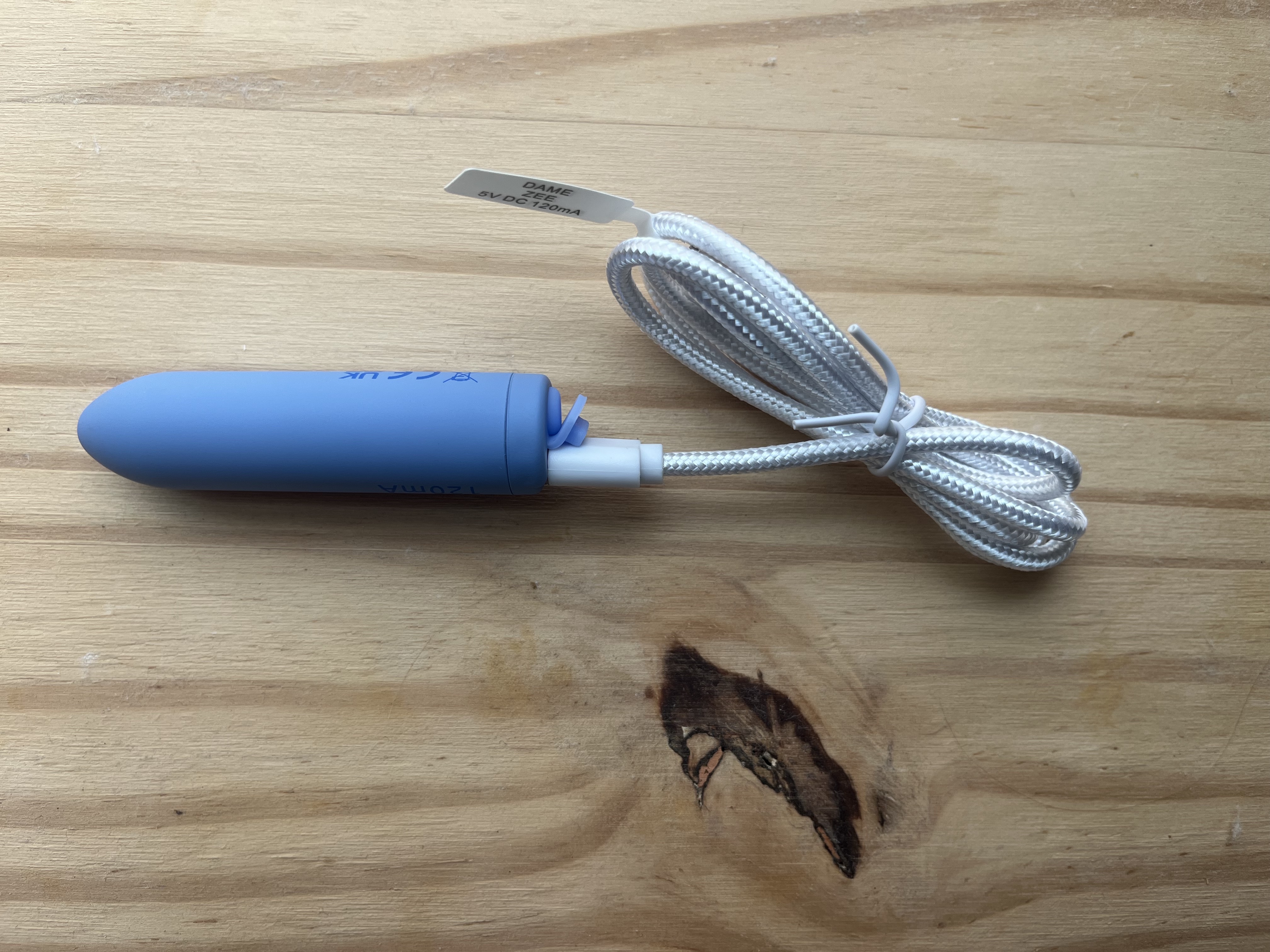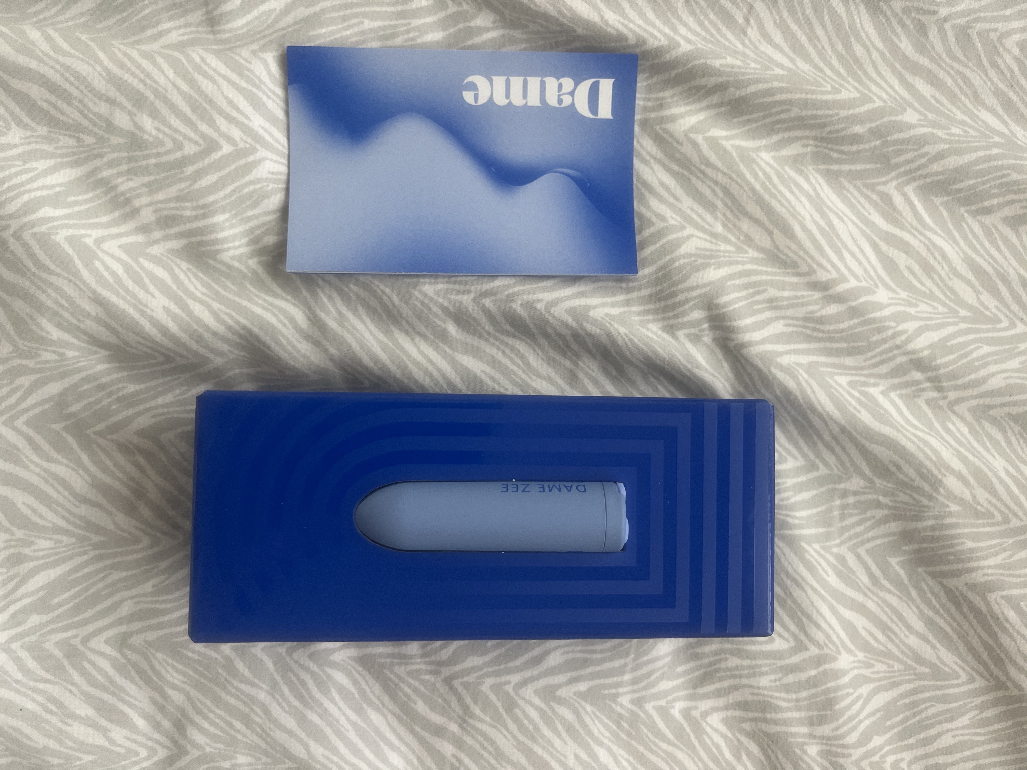 Dame designed the Zee for adult women. Neon pink and “discreet” lipstick bullet vibrators are cool, but sexual empowerment comes from having your pleasure taken seriously as an important part of your health. The Zee is a soft, grey blue with the device specs printed in dark blue on the side. It sort of looks like a tiny missile or something prescriptive. It has one button on the bottom that controls power and speed. Next to the button is a flap that covers the charging port, making it easy to find and keeping the device waterproof. The head is pointed, something I rarely see with bullet vibrators. I appreciate how Dame shook the design up here, it allows you to apply pressure with different textures. Overall, Zee has a simple, mature design reflecting its simple nature.